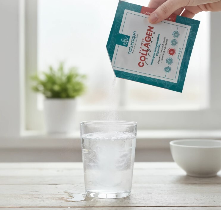 Хранителна добавка, съдържаща Хидролизиран колаген, Вит.C, Вит.B5, Вит.B1 – Съдържа подсладител.